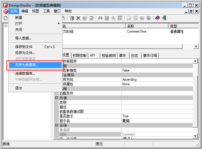 在Design Studio里,选择“文件”下拉菜单的“另存为数据库”,如下图所示: